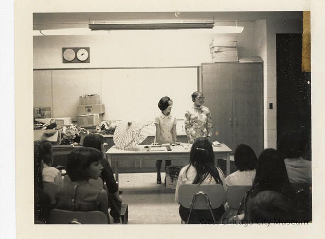 Indian Knoll School photos, black and white, square - Shows two women standing behind a table with a paper umbrella on it, in front of a class. The woman on the right is a Japanese exchange student. Back reads "Mrs. Watanabe Naomi from WC Hi exchange student from Japan"