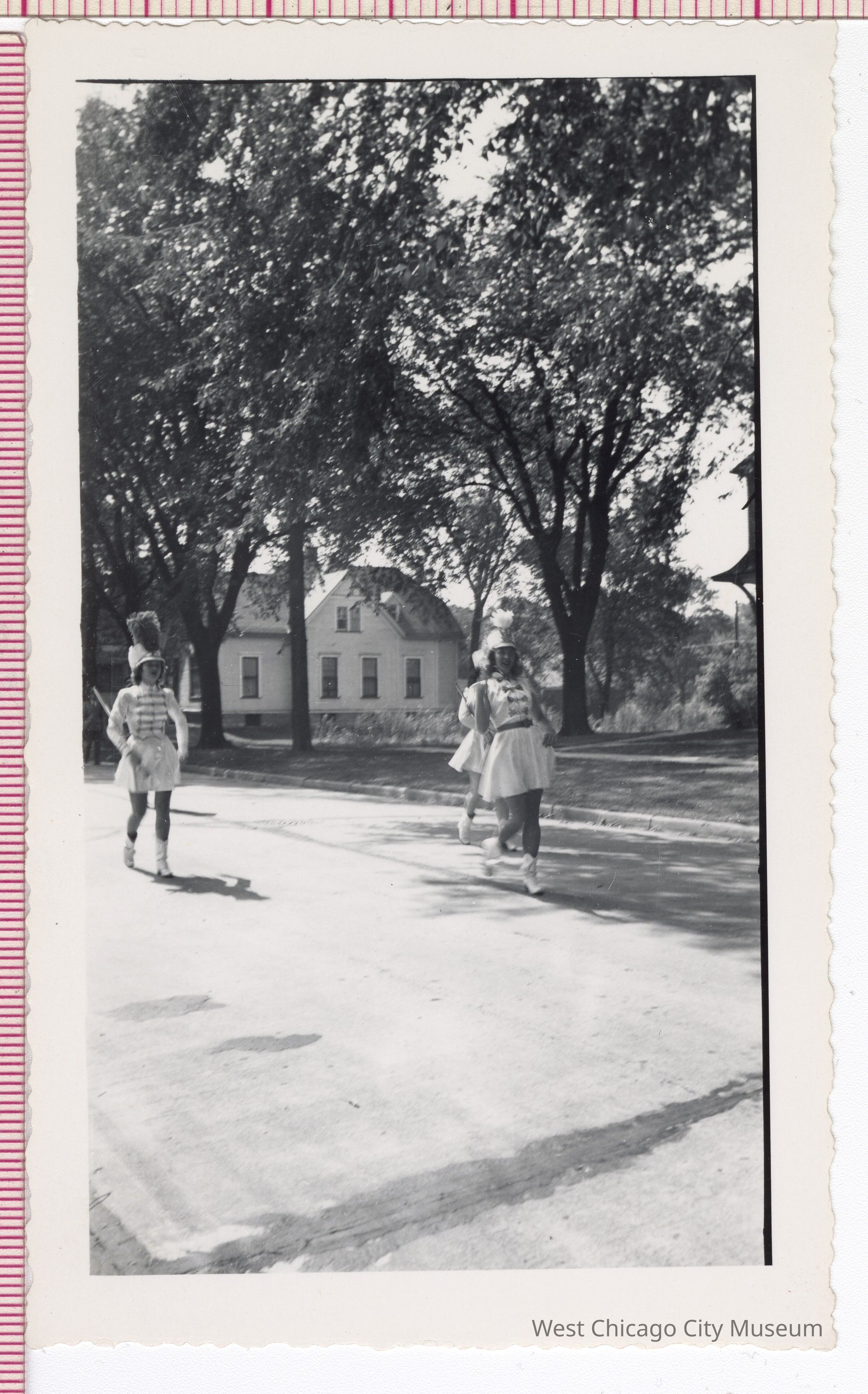 Photograph, b/w, three female members of a marching band (drum majors?) (in West Chicago?), houses in background, 5.5 x 3.25” white border with wavy edge, “766H”? stamped in black on reversePhotograph Details
