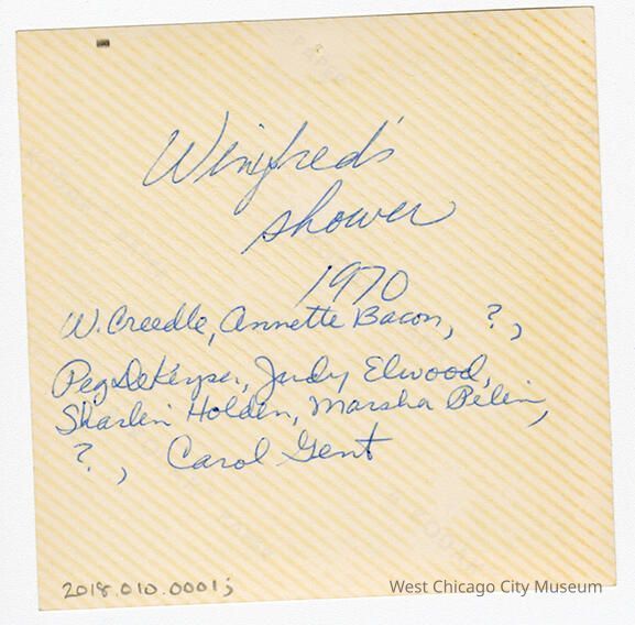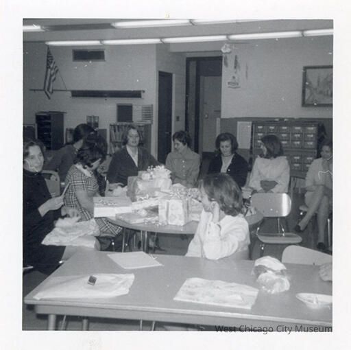 Indian Knoll School photos, black and white, square - shows a party with adult women, there are wrapped presents piled on a round table. Back reads "Winifred's shower 1970. W. Creedle, Annette Bacon, ?, Peg DeKeyser, Judy Elwood, Sharlin Holden, Marsha Pelin, ?, Carol Gent"Photograph Details