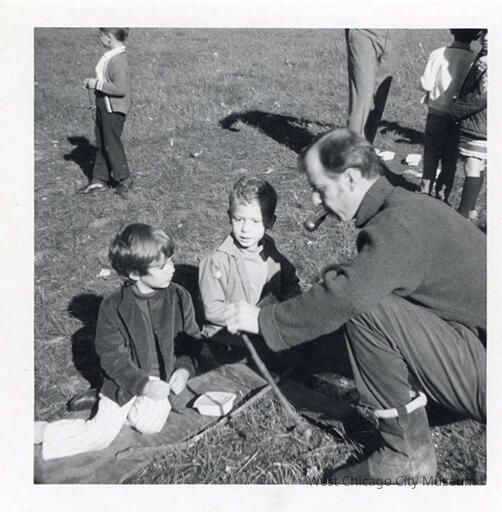 Indian Knoll School photos, black and white, square - Shows a man with a flashlight in his mouth demonstrating something with a fishing pole stick to two small, seated boys. Back reads "Mr. Creedle Fishing Trip 1970"