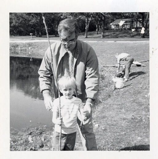 Indian Knoll School photos, black and white, square - Shows a small blond boy in a striped shirt with an older man behind him, holding up a tiny fish on a fishing line. Other boys and an adult are fishing to the right behind. They are along a pond to the left. Back reads "Mr. Frank Fernandes with Peter Jon Nicholson fishing 1970"