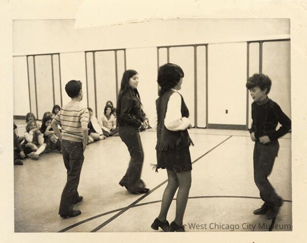 Indian Knoll School photos, black and white, rectangle - Shows 3 students, 2 boys and a girl, dancing with a dark haired woman in a dark fringed skirt. Other students seated on the floor, watching. Back reads "High School Spanish students dancing demonstration 72-73"
