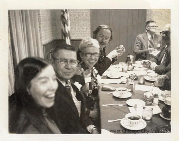 Indian Knoll School photos, black and white, rectangle - Shows adults seated at a table with plates and coffee cups in front of them, laughing. Lower left is a young woman, likely Sue Leslie. Back reads "Sue Leslie, 'Les' Leslie, Blanche Leslie, Dr. Barnes"Photograph Details