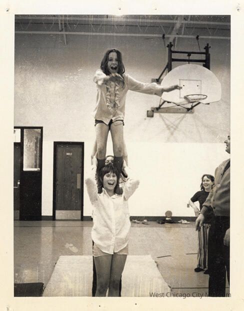 Indian Knoll School photos, black and white, rectangle - shows a girl in a ruffled white skirt standing on the shoulders of another girl, being steadied by a girl behind. There is a basketball hoop in the background. Back reads "71-72"