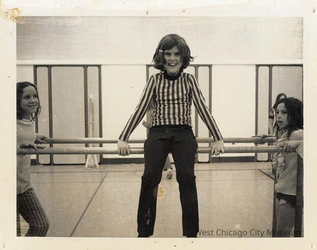 Indian Knoll School photos, black and white, rectangle - shows a girl in a striped shirt and dark pants, smiling, seated on one of a set of parallel bars for gymnastics. There is a girl on each side of the bars, in between them. Back marked "71-72" Girl on beam identified as Diana Markl in photo 2018.010.0001by