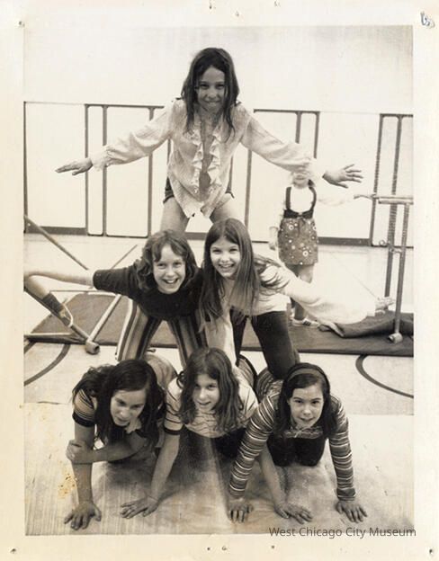 Indian Knoll School photos, black and white, rectangle - shows a pyramid of girls, three rows. They are all smiling, with on the top of the pyramid is wearing a white shirt with a ruffled front. There is gymnastic equipment behind them. Back reads "Class of 71-72"