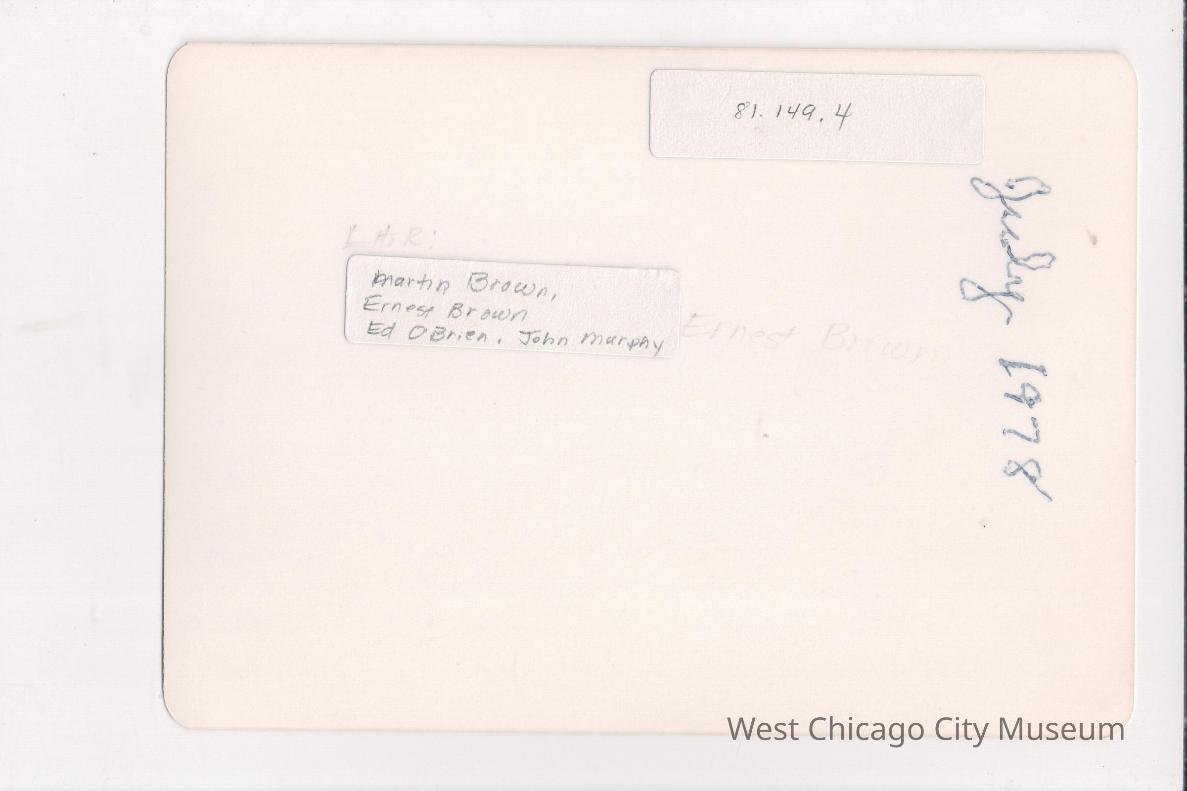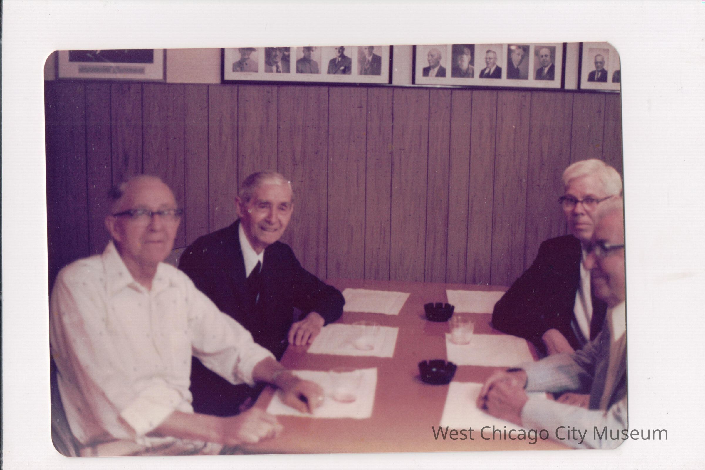 Photograph, color snapshot, showing Martin F. Brown, Ernest Brown, John Murphy, and Edward Morse O'Brien seated at a table with 6 placemats at the American Legion Post, West Chicago, July, 1978. They are all older, with grey hair. Behind them is a paneled wall, with photographs of members above the paneling. Back has the men's names on written on a label stuck to the back and "81.149.4"Photograph Details