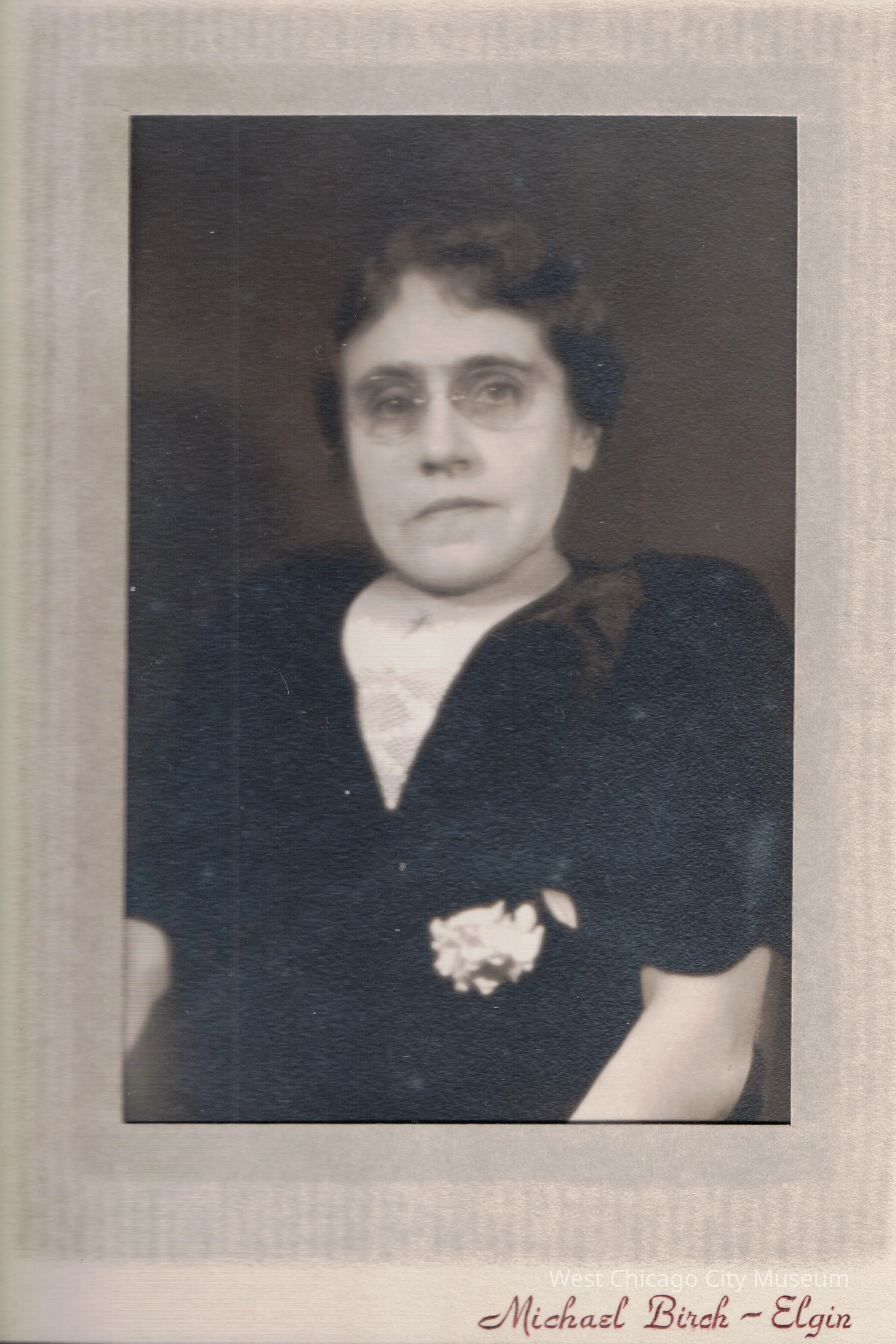 Photograph, black and white, of Helen Hills. She is a middle aged woman with short, wavy dark hair, wearing glasses and in a black short sleeved dress with white showing though at the "v" of the collar. Photo is 3x5 photograph, and in a paper frame from the Photographer, Michael Birch, Elgin.Photograph Details