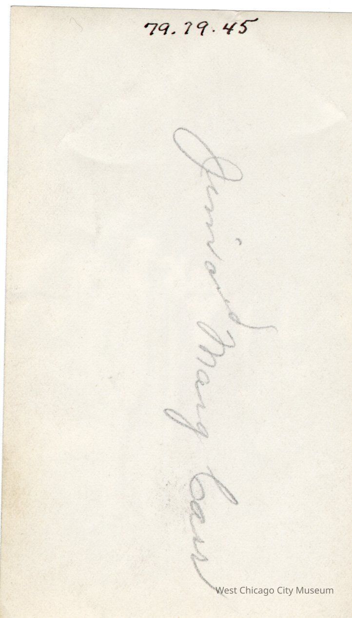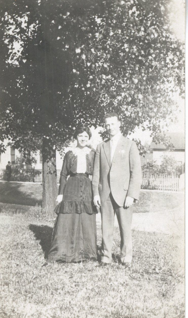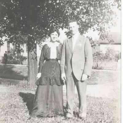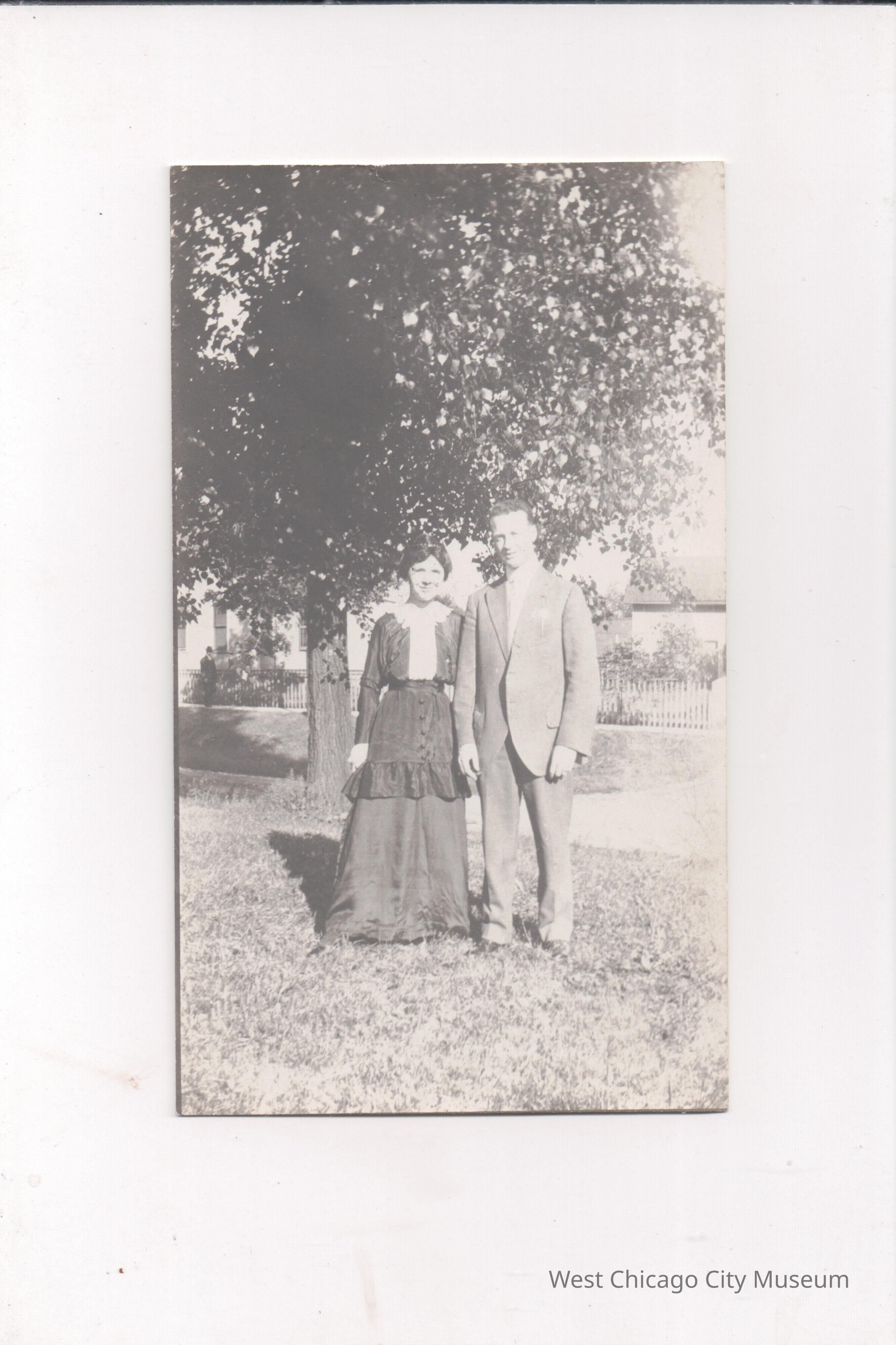 Photograph, black and white, portrait orientation, showing James Carr and Marguerite nee Dempsey Carr. They are standing quite close, like a couple. She is wearing a long dark dress with a dark peplum, long sleeves and white yoke and collar. He is in a medium colored suit. They are outdoors, with a large tree behind them, as well as a house and small out building. 2 1/2'' x 4 1/4''Photograph Details