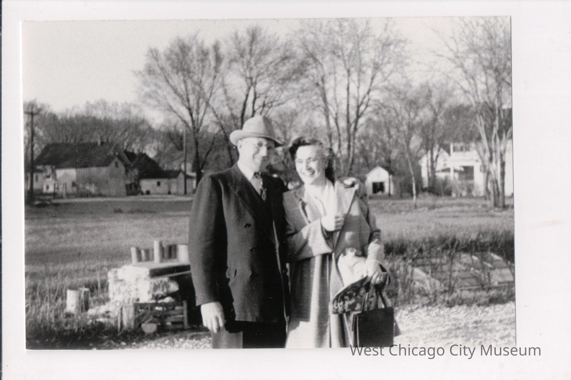 Photograph, black and white, showing Mr. Paul C. and Mrs. Laura Schueneman Shuler outdoors. Behind them are various houses and outbuildings, and it looks like there is a cold frame from growing plant on the right side. They are wearing coats and both have hats (Laura Shuler is holding hers in the same hand with a magazine and her purse.)