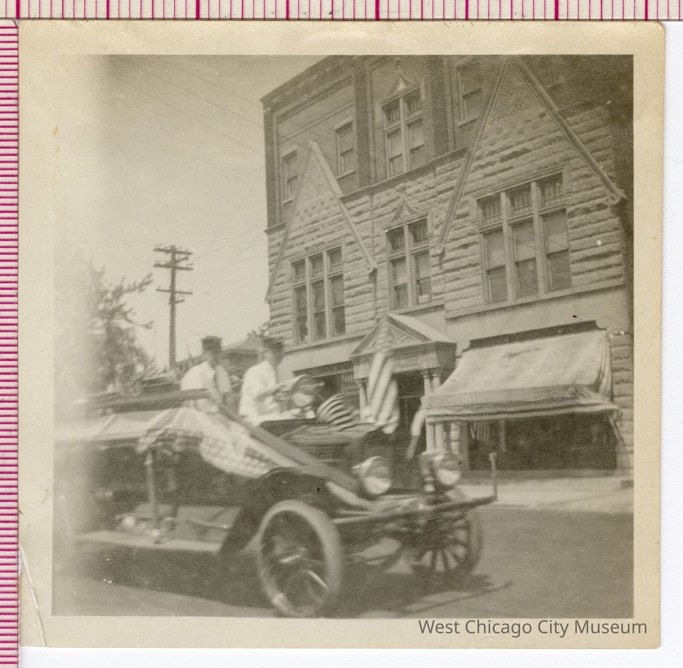 Photograph, b/w July 4th parade-1922-on west Washington Street near Bolles Opera House-car float with flags 3 1/2" x 3 1/2"Photograph Details