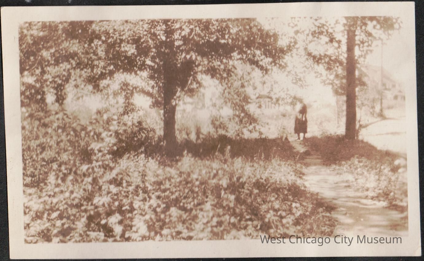 Photograph of woman standing in distance on dirt path through trees at 728 Carleton Rd Westfield NJ 9.30.1923