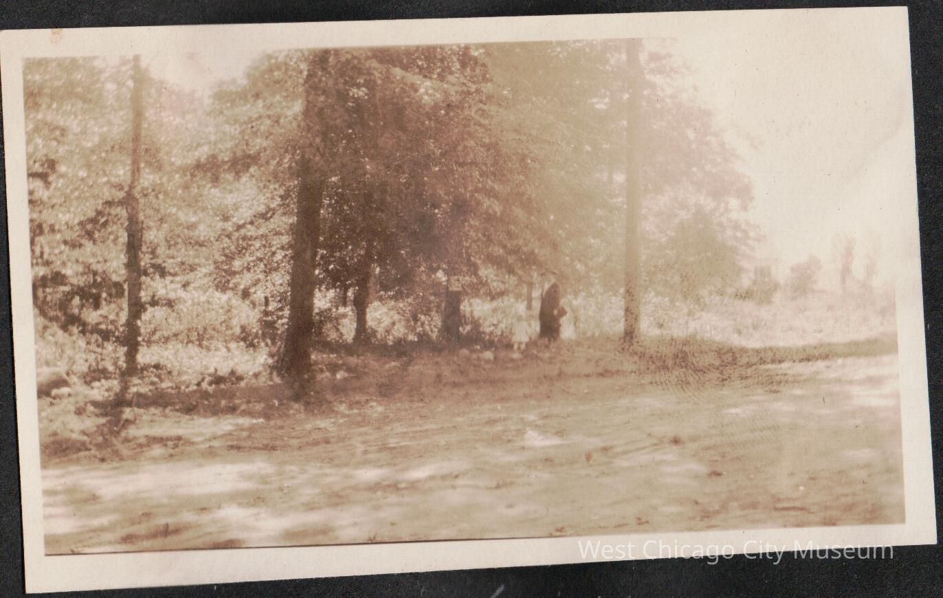 Photograph of view across dirt road to adult and child standing beneath tall trees at 723 Carleton Rd. Westfield NJ 9.30.1923