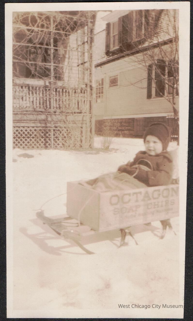 Photograph, black and white, showing Arleen Alexander seated in Octagon Soap Chips box on sledblades, dated 2.18.1924. She is a toddler, and wearing a black coat and knit cap. She is tucked in with a blanket, and is holding the sled rope. There is snow on the ground. There are two houses behind her, close together, partially visible. The porch on the left has a railing and a trellis.Photograph Details