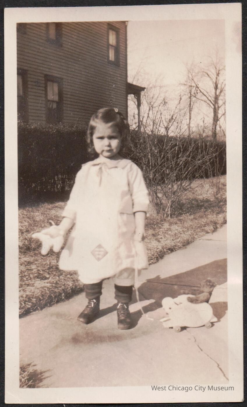 Photograph, black and white, of (probably) Arleen Alexander standing on sidewalk with stuffed toy in one hand, other hand holding handle of wheeled pull toy with teddy bear on seat. She is wearing a short white dress with bloomers and dark socks and shows. She has short, chin length hair. Behind her is a hedge, trees and bushes without leaves and a two story home which we can only see the side of.Photograph Details