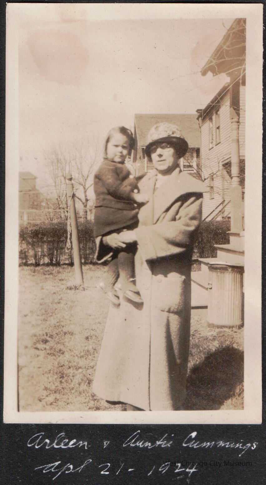 Photograph, black and white, portrait orientation, showing "Auntie Cummings" holding Arleen Alexander in arms in yard 4.21.1924. They are in coats, for chilly spring weather. There is a row of homes on the right side of the photo, the nearest one has a metal garbage can in front. "Auntie Cummings" is also wearing glasses and a cloche hat.Photograph Details