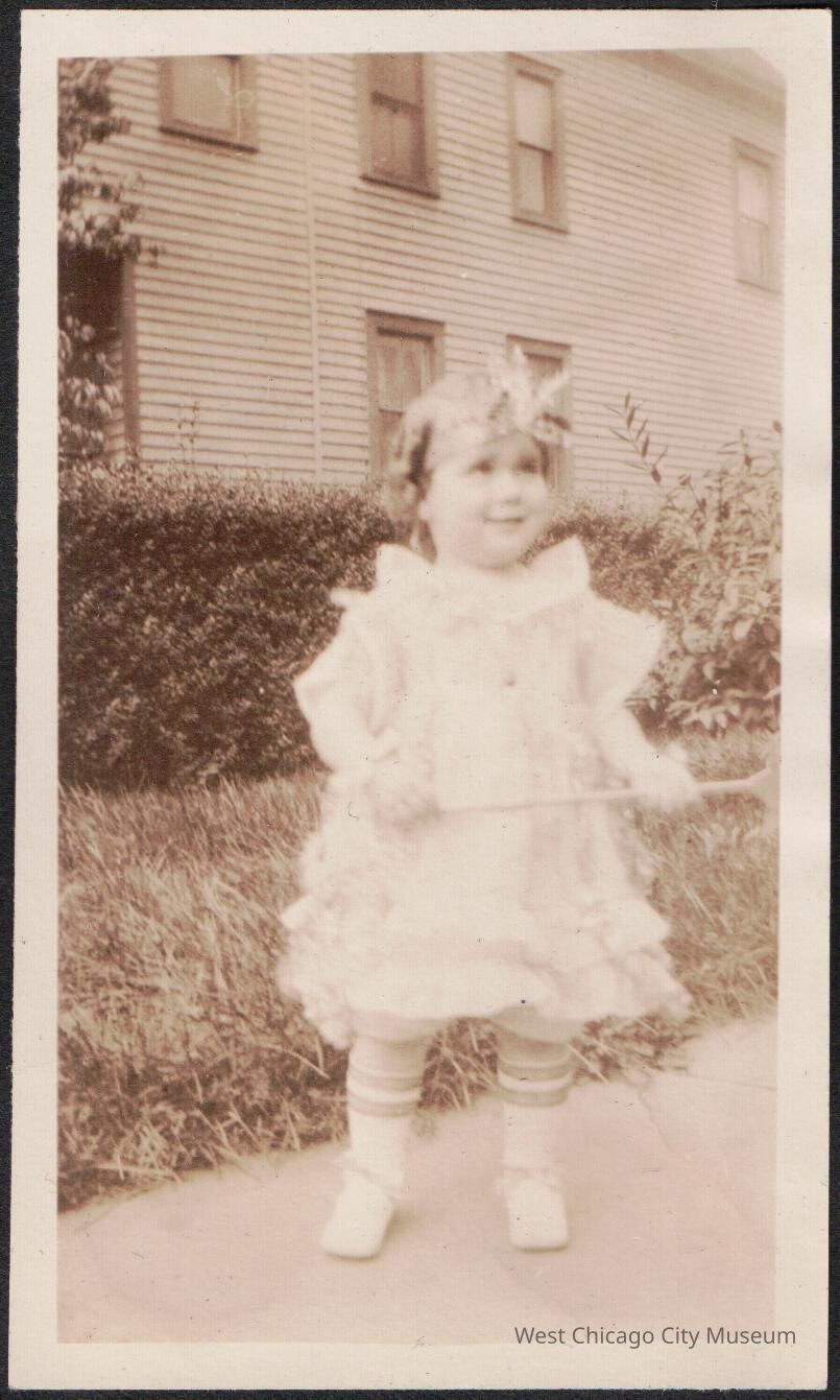 Photograph, black and white, of Arleen Alexander in fairy costume for Westfield Baby Parade, 10.12.1923. She is smiling, standing on a sidewalk with a frilly while dress and holding a scepter. She has a headband across her forehead with a decorative star or spray of some sort coming off it. There is a large two story house behind her, as well as bushes.