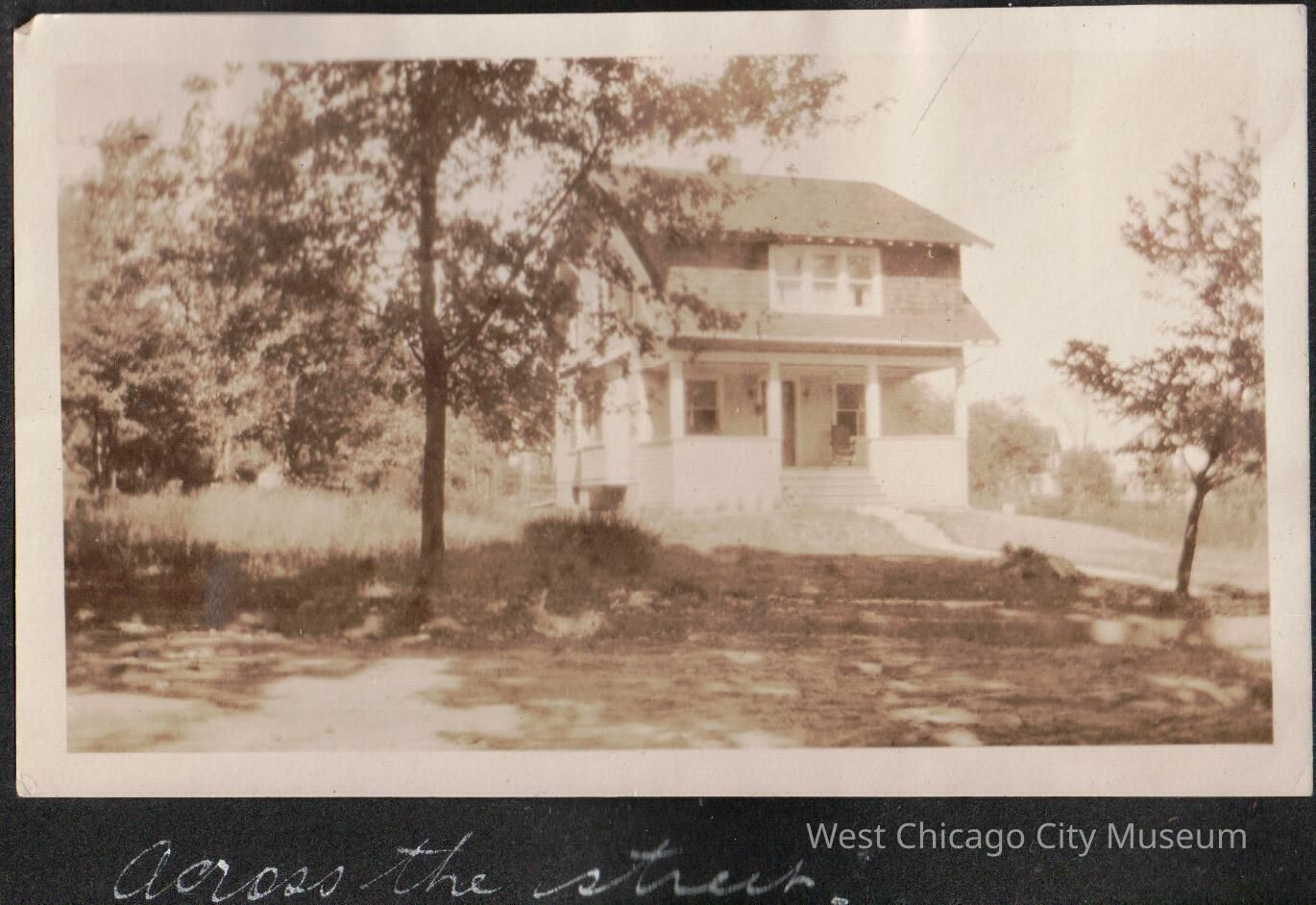 Photograph of two story house, 731 Carleton Rd in Westfield, NJ. The home is across the street from lot at 728 Carleton Rd Westfield NJ. Snapshot, black and white, landscape orientation. There are two trees in front, and more trees behind. Pasted on black scrapbook paper.Photograph Details