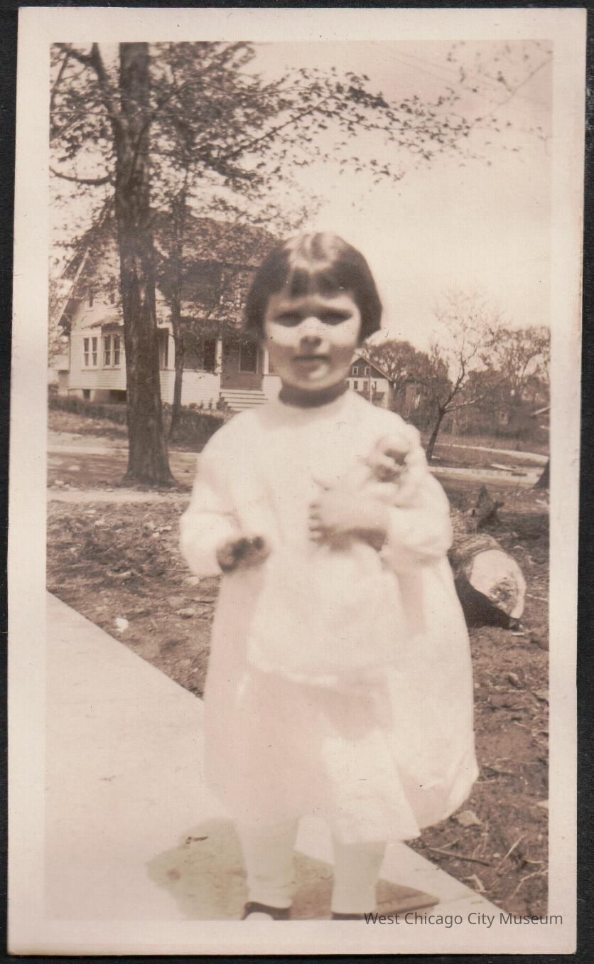 Photograph, black and white. Shows a young child, Arleen Alexander, wearing a white dress with bobbed hair on sidewalk, holding a doll. Dated 5.13.1924. Behind her, left, is a two story home with a basement and a white front porch and side bay window. There is another building behind her right. Pasted on black scrapbook paper.Photograph Details