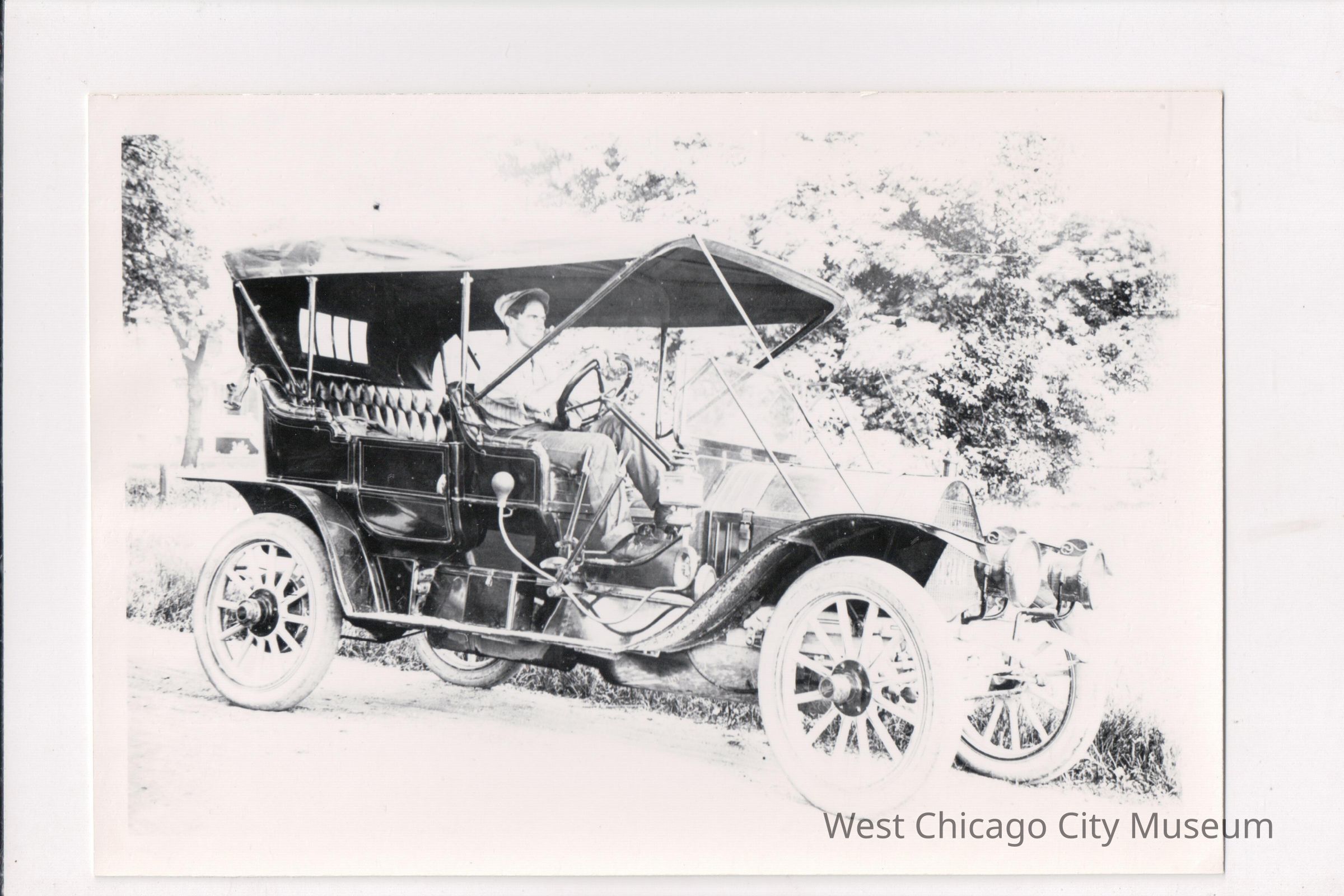 Photo, black and white, of Bert Fraza, local automobile dealer in his Mitchell touring car, 1911. The car has an open body, and seats 4 comfortably, with a soft awning on top. Fraza is dressed for work, in pants with a rolled cuff, loose shirt and flat cap. The photo is taken outdoors, and is overexposed. The image may have been developed backwards; the driver if on the right side of the car, not the left.Photograph Details