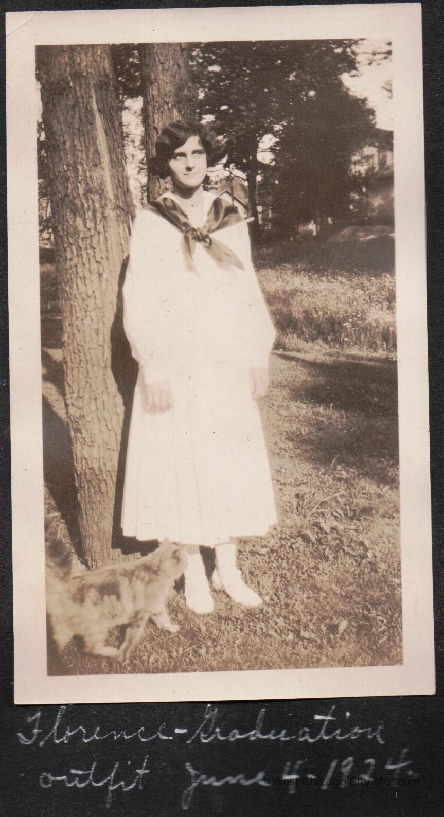 Photograph, showing a young woman with bobbed dark hair, smiling, looking to the right of the camera. She is wearing a white dress with a large colorful scarf that draped over her shoulders and tied in front. She is wearing white boots, and the is a long hair cat near her feet. Photo is taken outdoors. The photo is pasted to a piece of place scrapbook paper. Below image it reads in white "Florence - graduation outfit June 4 1924" Possibly Florence Julia Hayward Feulner, see note.Photograph Details