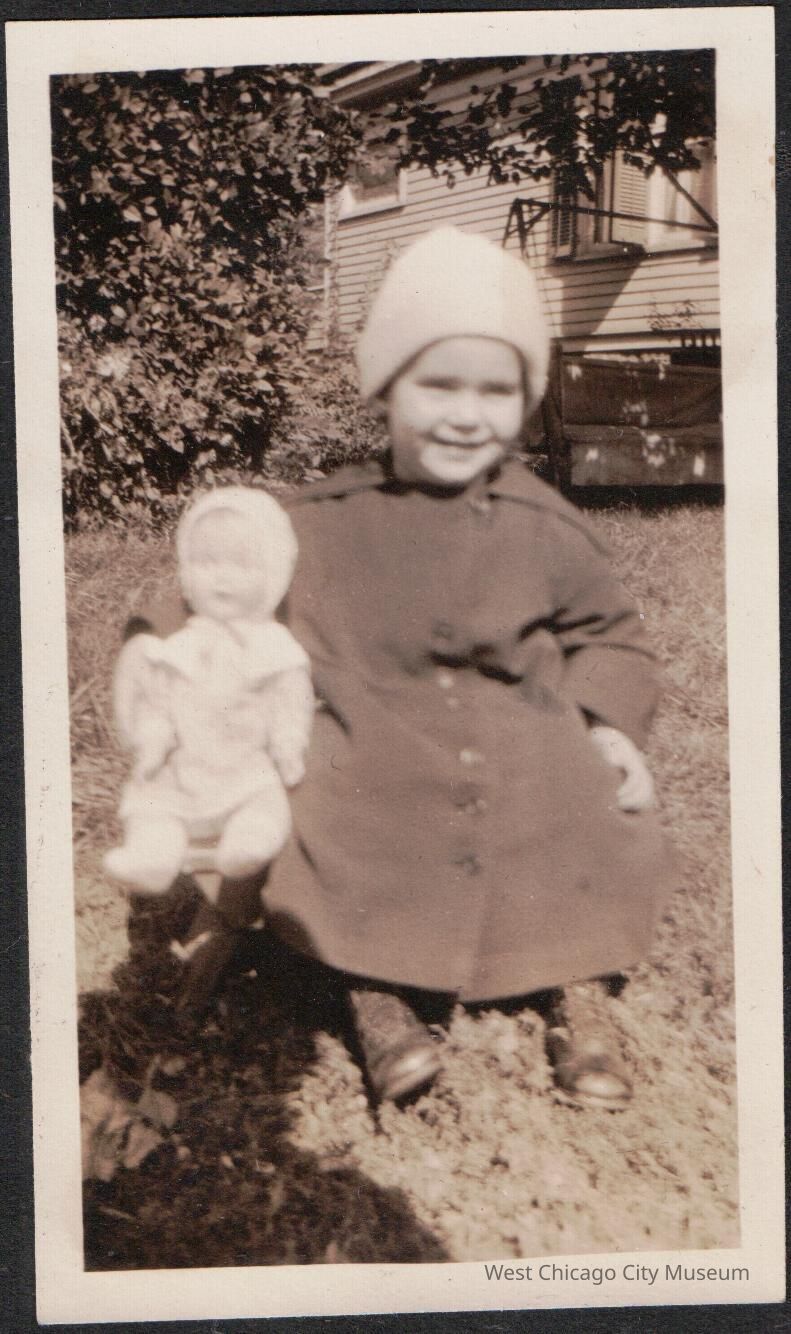 She and the dolls are slightly blurry; the camera focused on the scenery behind them. She is wearing a dark coat and white cap. There is a house with folding shutters behind her, and a bench swing. 10.7.1923