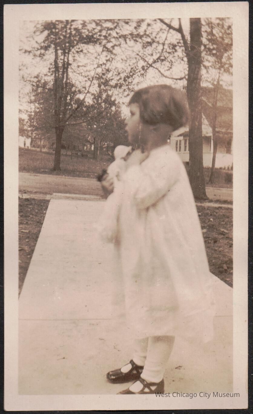 Arleen Alexander with bobbed hair, viewed from side with doll in arms 5.13.1924. She's in a white, loose dress, white stocking and black shoes with a decorative strap. She's standing on a sidewalk which leads to the street. In the background, across the street is a white 2 story home.Photograph Details