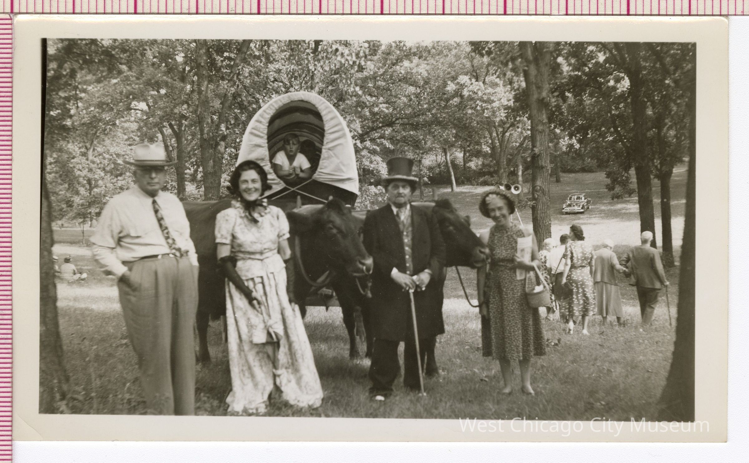 One of two photographs: Miriam Leedle Ekbom, Stella Wurtz Gregory, & two unidentified figurers in front of conestoga wagon.Photograph Details