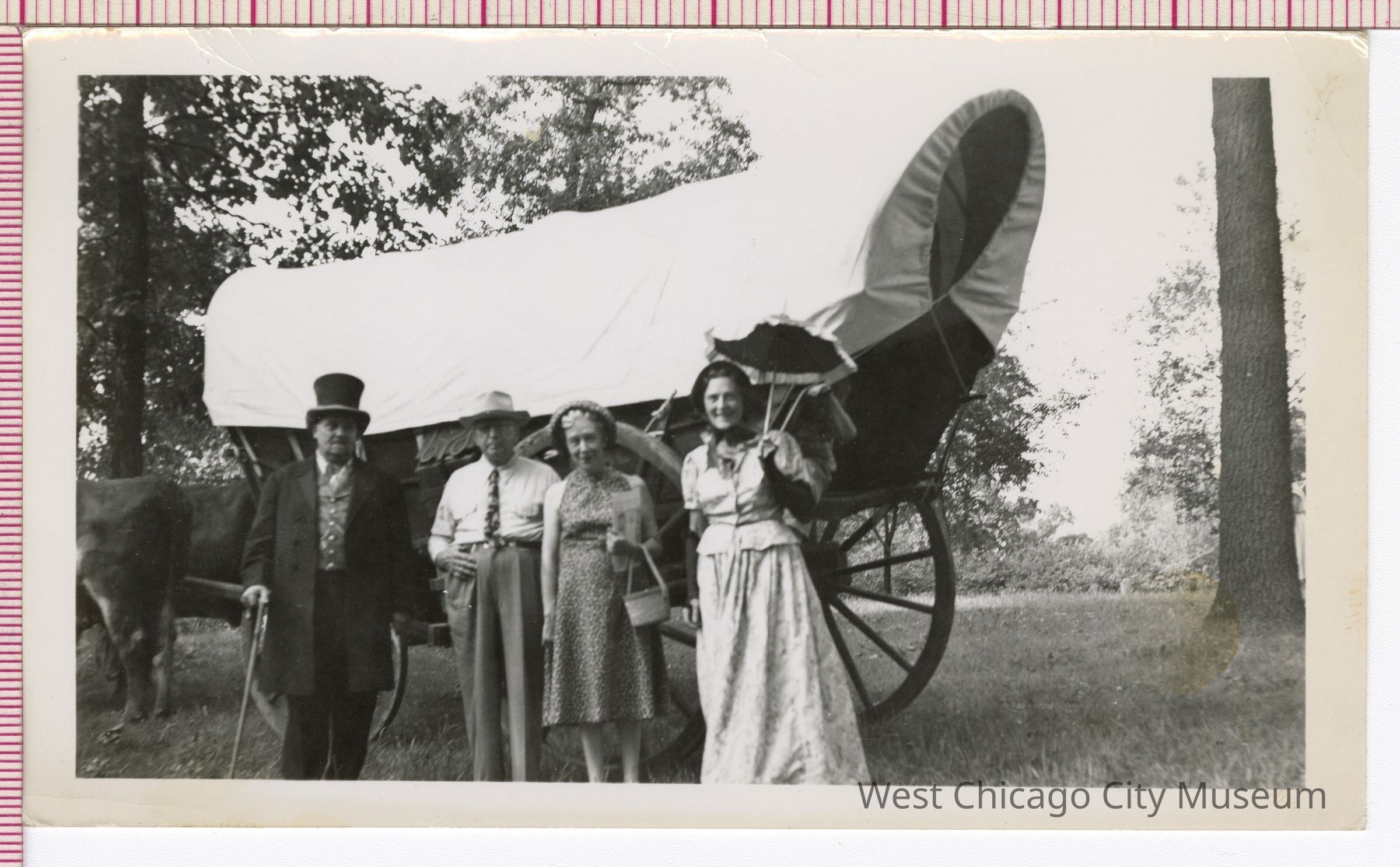 One of two photographs: Miriam Leedle Ekbom, Stella Wurtz Gregory, & two unidentified figurers in front of conestoga wagon.Photograph Details