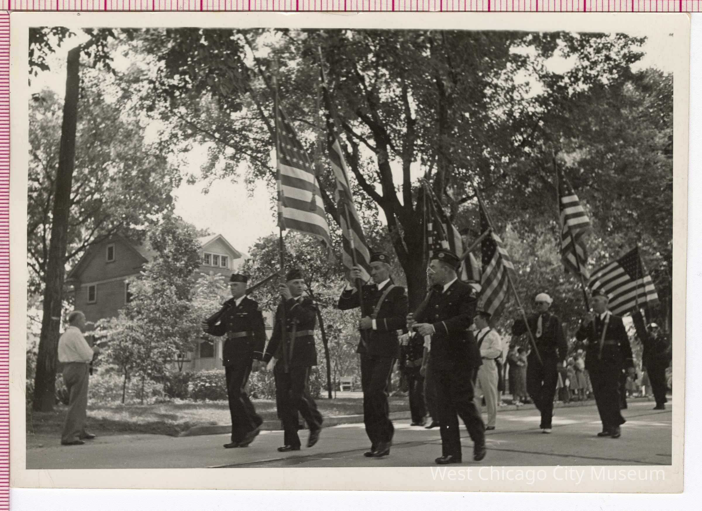 Photograph: Parade, with Herb Carlson, Lawrence "Pop" Voelz, and Walter Fessler as color guard; 7 x 5"Photograph Details