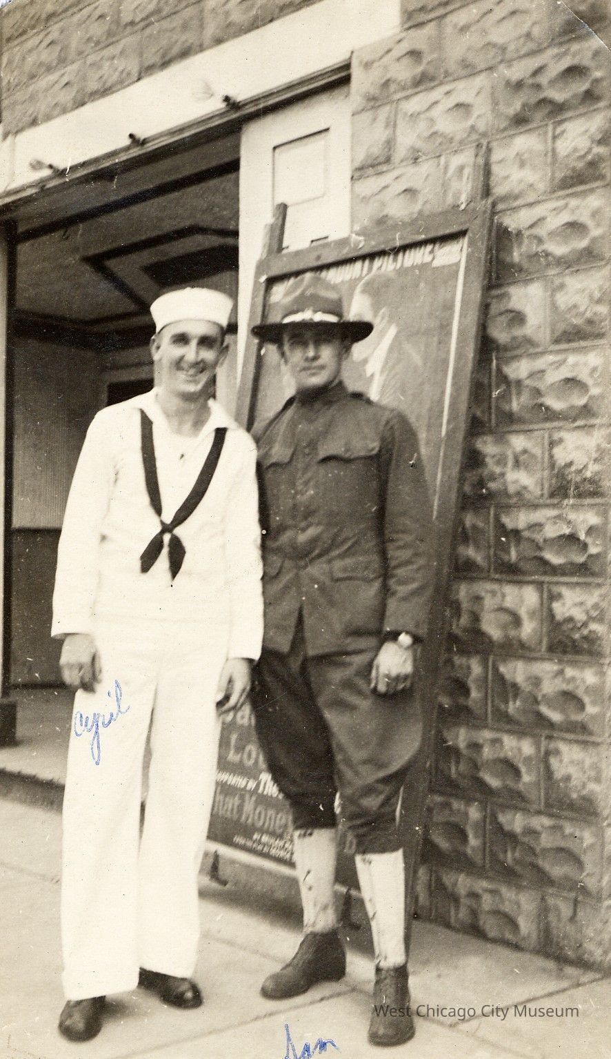 Photograph, Sam Gregory on right in WWI army uniform, Cyril Dieter in WWI navy uniform, in front of Lyceum Theatre, b/w 3 1/4" x 5 1/2"Photograph Details