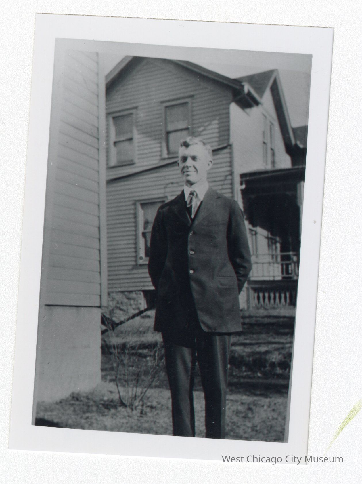 Photo; black and white; man outisde house; "Henry Voelz" written on backside in pen; Good condition: minimal wear throughout; Dimenisons: 3.5"x5"Photograph Details