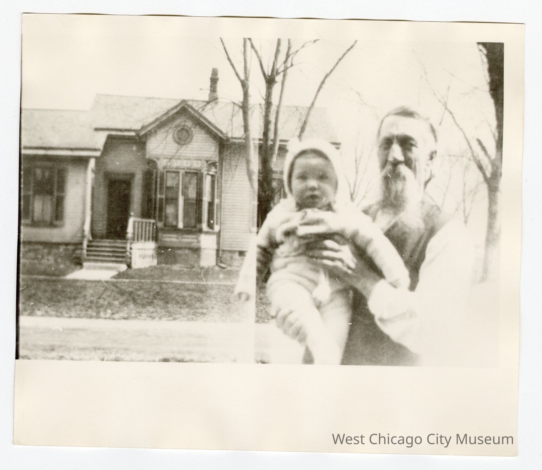 Photograph: Albert Hills: Photograph; black and white; copy?; picture of elderly man holding baby outside of house; Albert Hills; Good condition: some water damage visible; Dimensions: 6"x7"Photograph Details