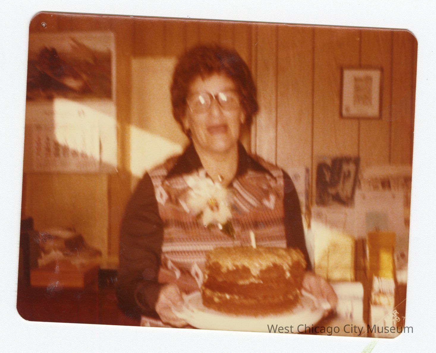 Photograph: Czajka, Theresa: Photograph;sepia?; elderly woman holding cake; "Theresa Czajka" written in pencil on back side; rounded edges; Good condition: some discoloration visible on back side; Dimensions: 3 1/2"x 4 1/4"Photograph Details