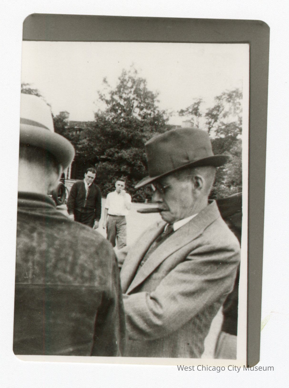 Photograph; black and white; rounded edges; includes copy; "James Bolf" written in pencil on back side; photograph of elderly man smoking cigar outdoors; Good condition: minimal wear throughout; Dimensions: 3.5"x 4.5"Photograph Details