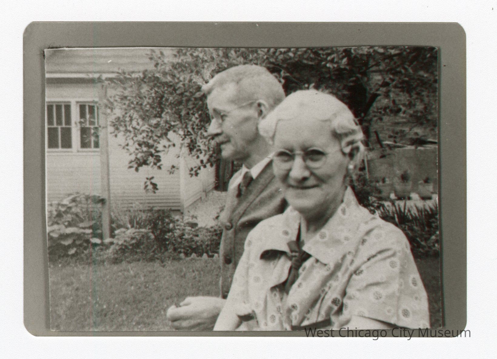 Photograph; black and white; rounded edges; includes copy; "James and Mary Bolf" written in pencil on back side; photograph of elderly couple in backyard garden; Good condition: minimal wear throughout; Dimensions: 3.5"x4.5"Photograph Details