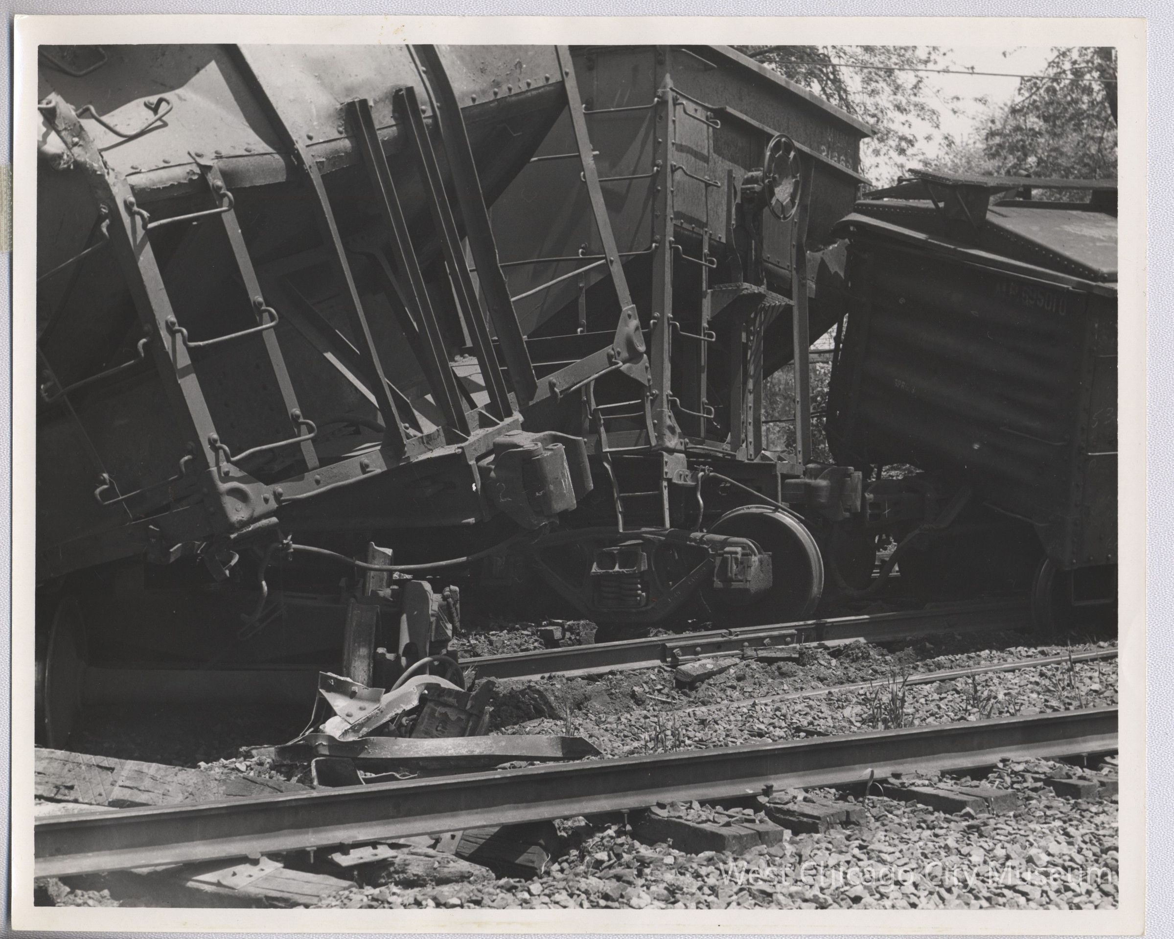 One of 7 Photographs: 8 x 10 B/W Glossy of train wreckage, stamp on back R. G. Benson 321 Franklin St. Batavia, IllinoisPhotograph Details