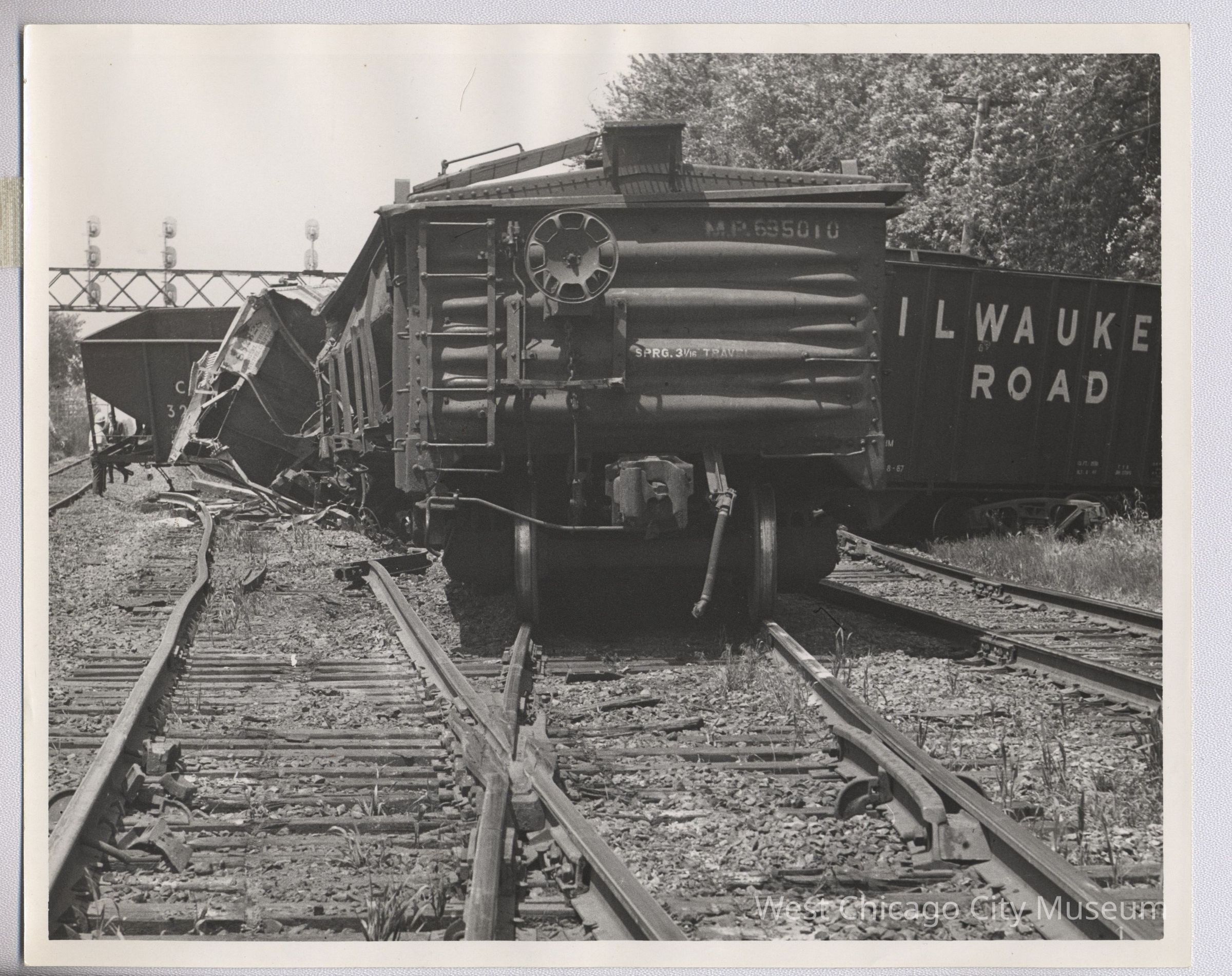 One of 7 Photographs: 8 x 10 B/W Glossy of train wreckage, stamp on back R. G. Benson 321 Franklin St. Batavia, IllinoisPhotograph Details