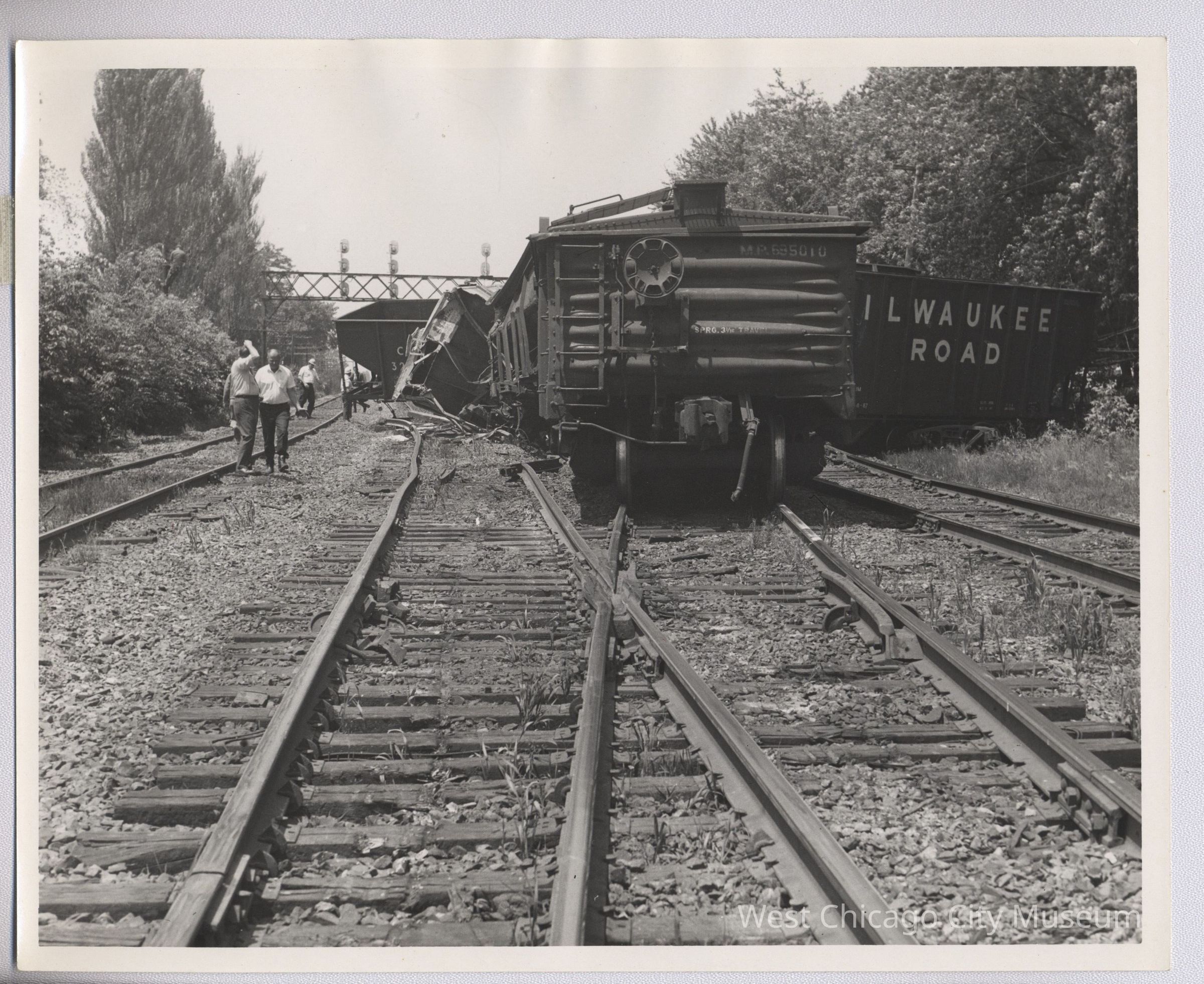 One of 7 Photographs: 8 x 10 B/W Glossy of train wreckage, west of JB Tower 6-5-1970, stamp on back R. G. Benson 321 Franklin St. Batavia, IllinoisPhotograph Details