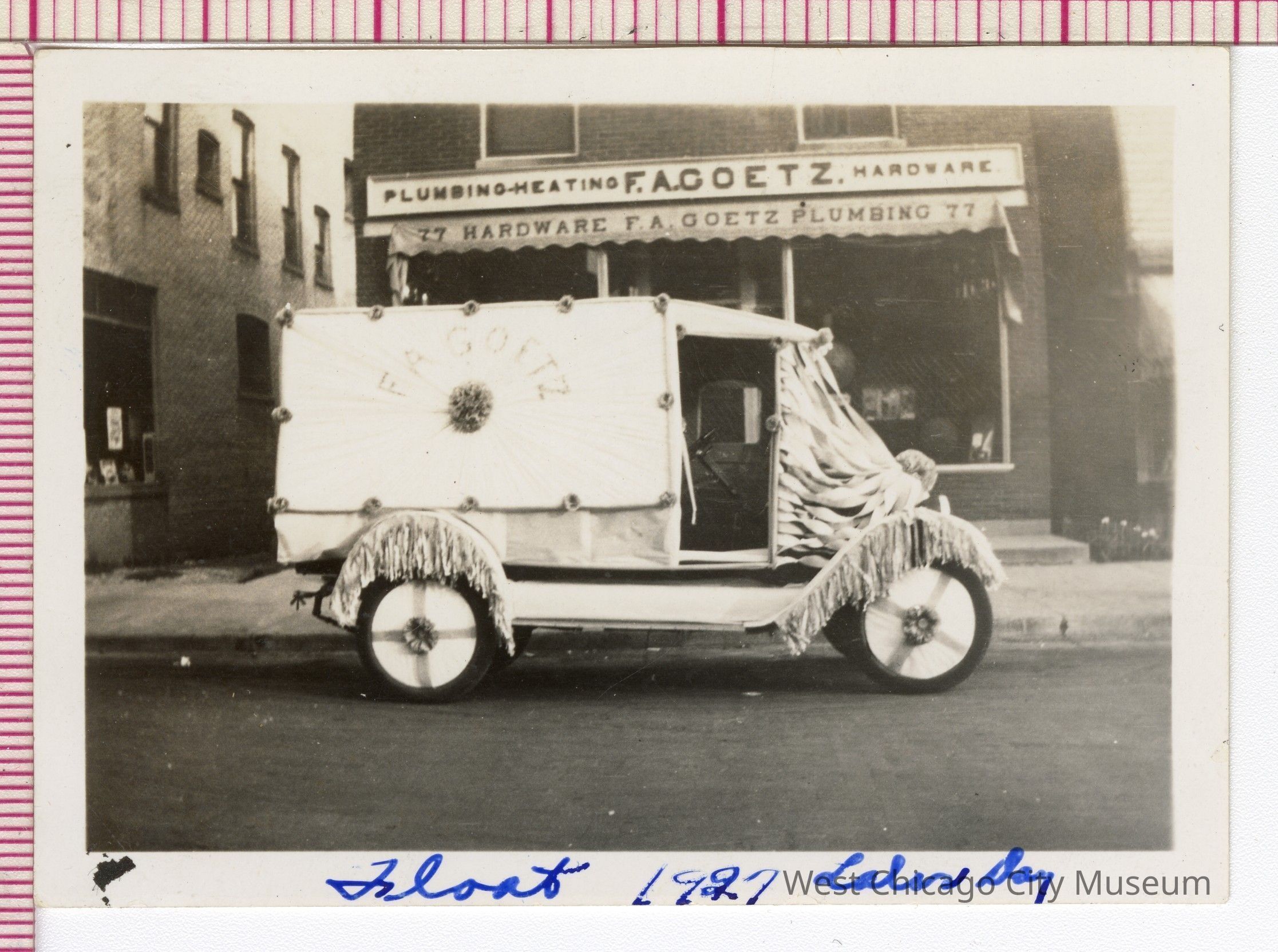 Photo, B&W: Annual Homecoming Day, September 5, 1927: F.A. Goetz float in front of Goetz Hardware on West Washington St. "Float 1927 Labor Day" is written in blue ink on photo's bottom border. 2 1/2" h x 3 1/2" wPhotograph Details
