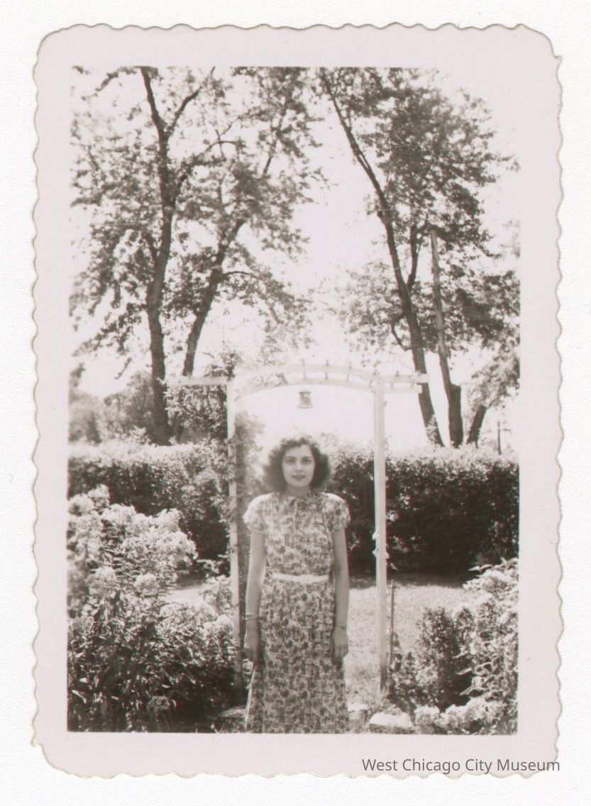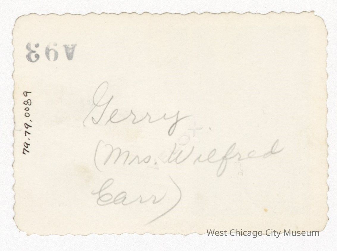 Photo, black and white of Mrs. Wilfred Carr standing under a trellis in a garden. She is wearing a short-sleeved dress with a white belt and is smiling at the camera. Back of photo reads “Gerry (Mrs. Wilfred Carr), 79.79”. 2.5” x 3” good condition.Photograph Details