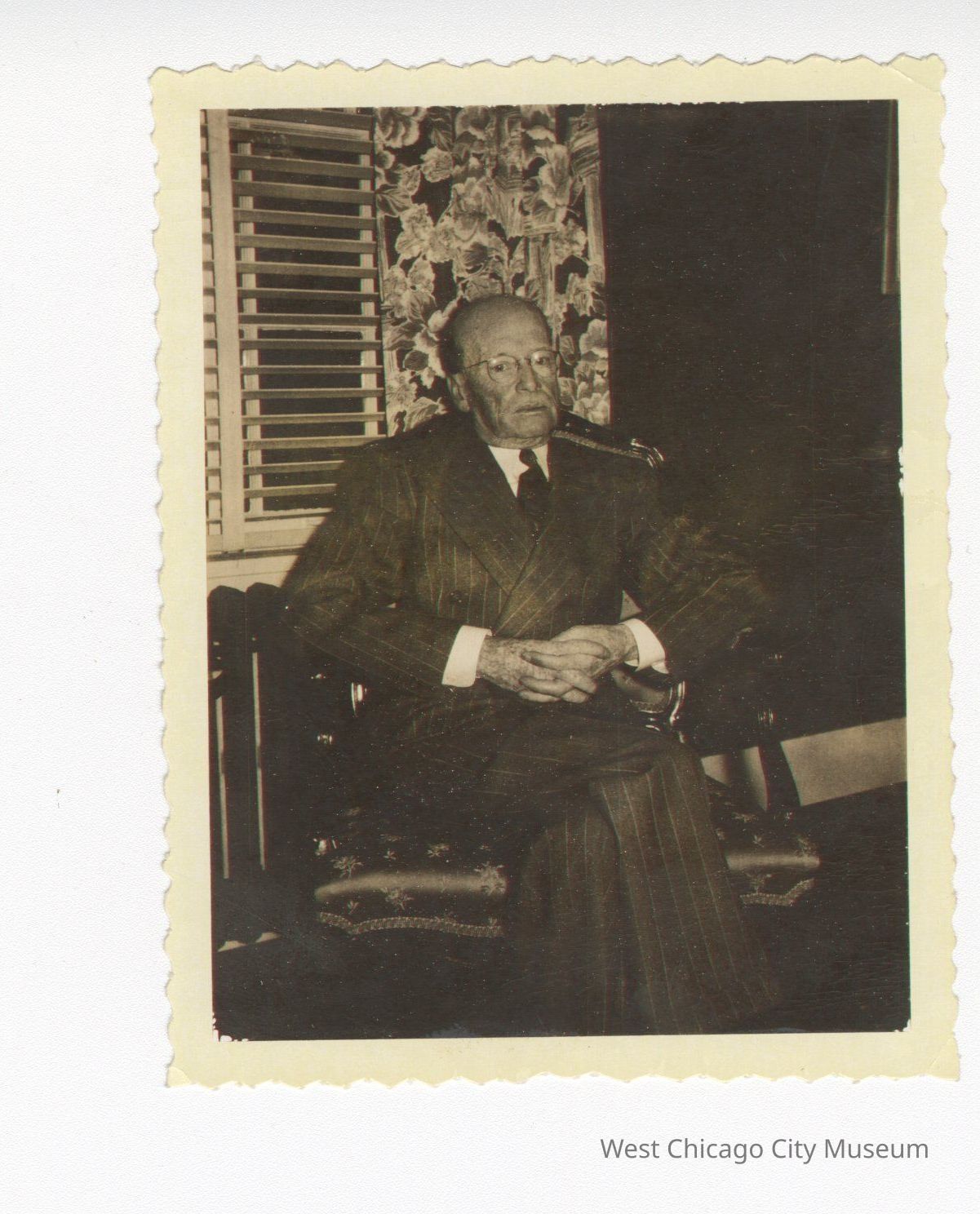 Photo, black and white of James Carr as an older man. James is seated in a chair and wearing a pinstripe suit. He has his hands folded in his lap and is not smiling. Back of photo lists his namePhotograph Details
