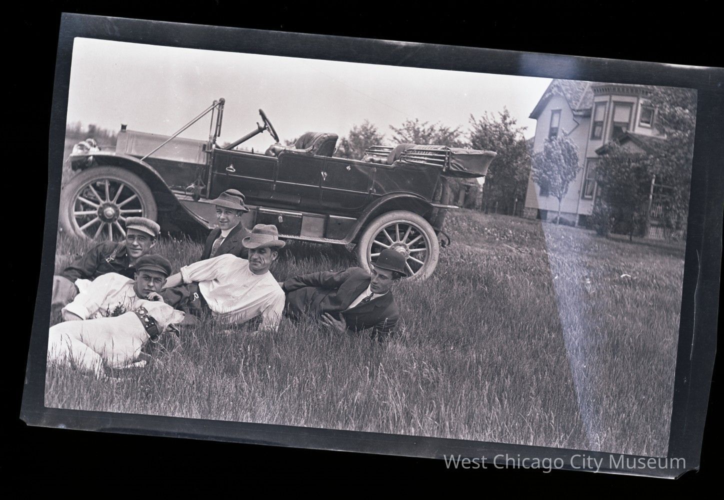 Negative and scan of five men laying grass in front of car with dog, house in background