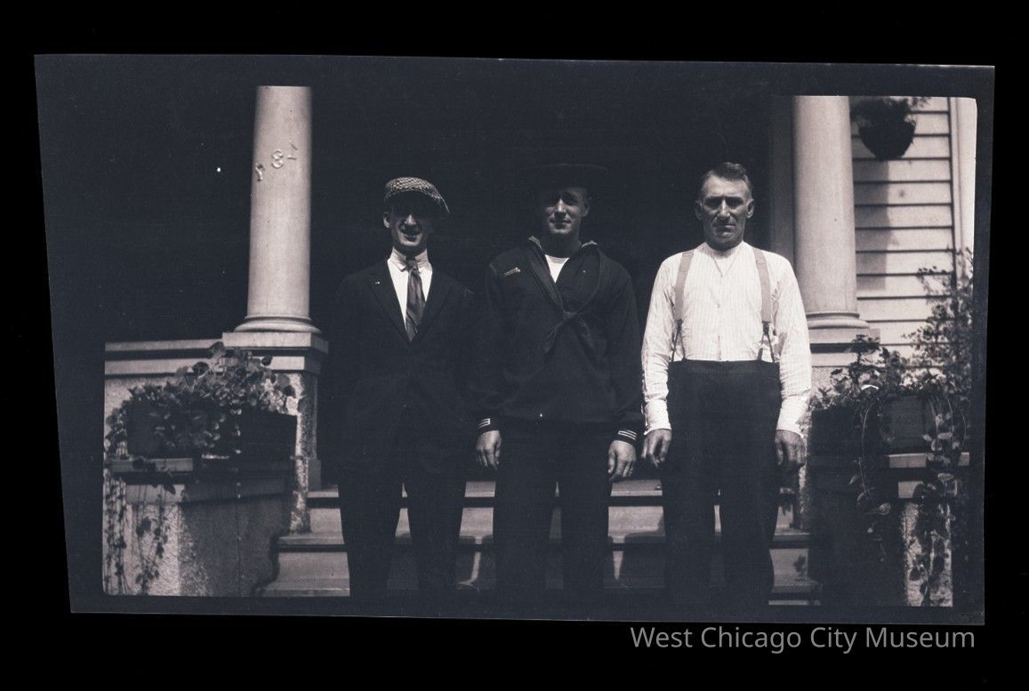 Negative and scan of three men standing in front of porch on house, flowers to both sides, "187" address?