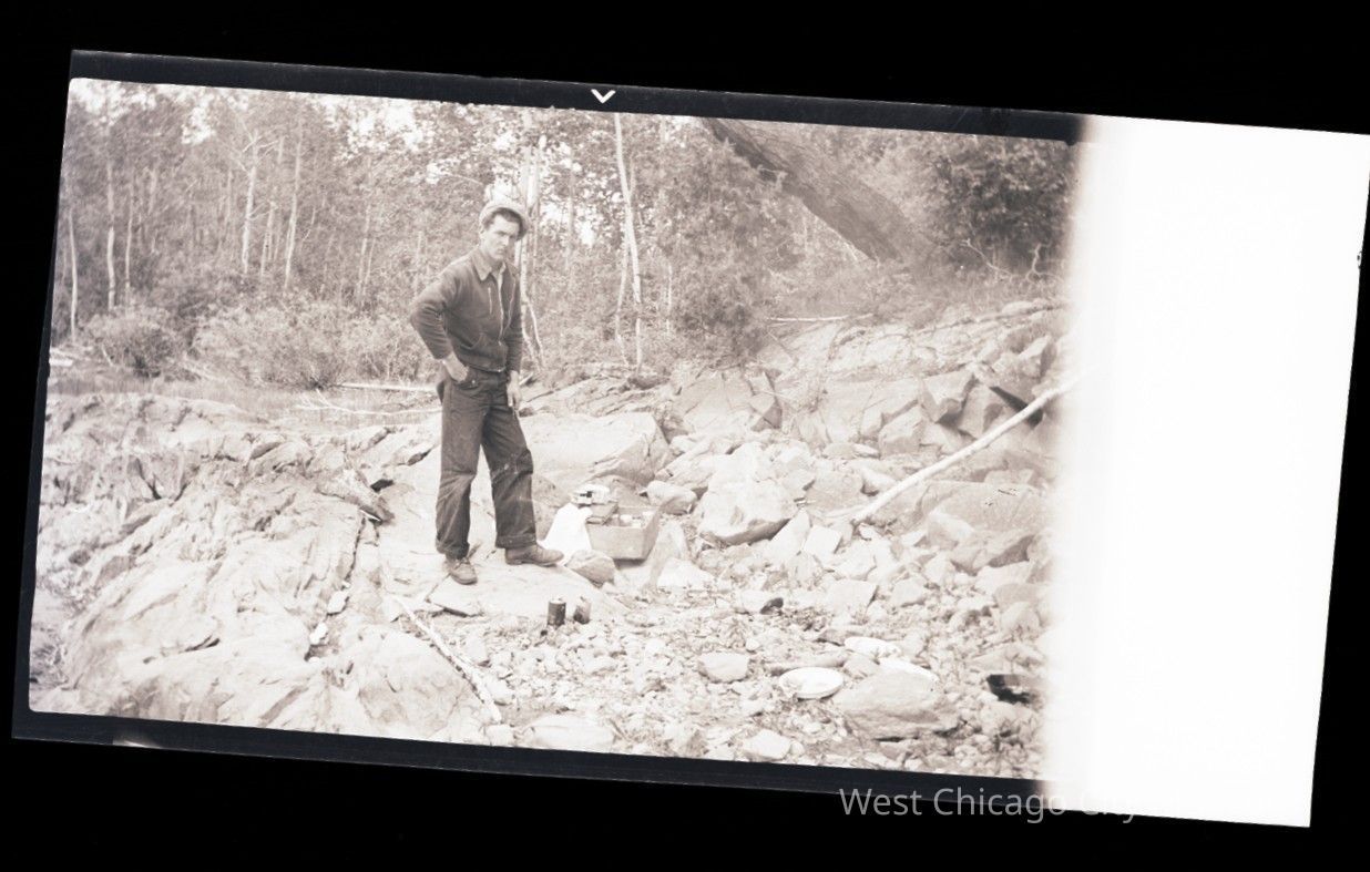 Negative and scan of man with hands on hips, large rocks at feet, trees/forest behind him