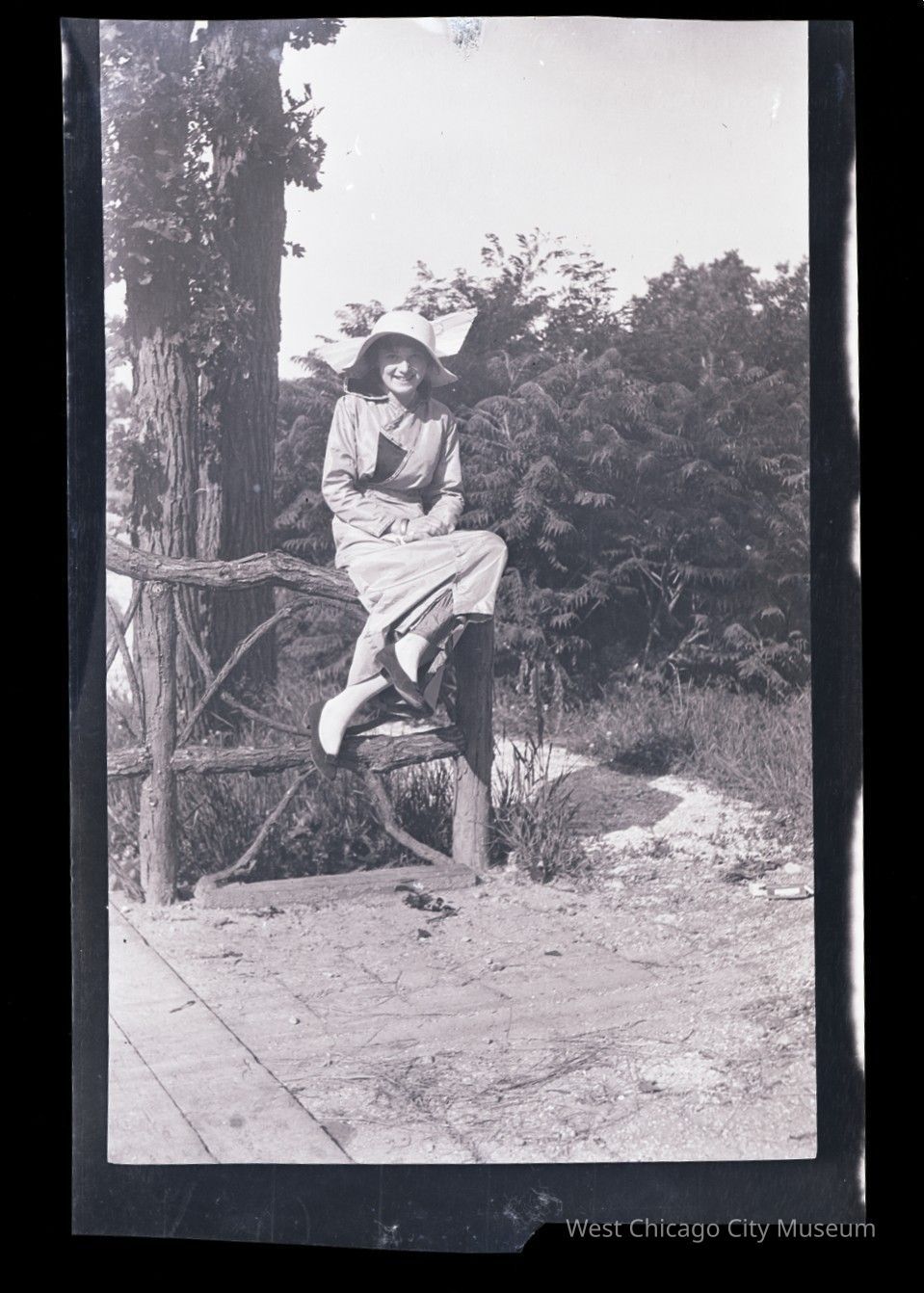 Negative and scan young girl in hat and long skirt sitting on log fence, trees and bushes in background