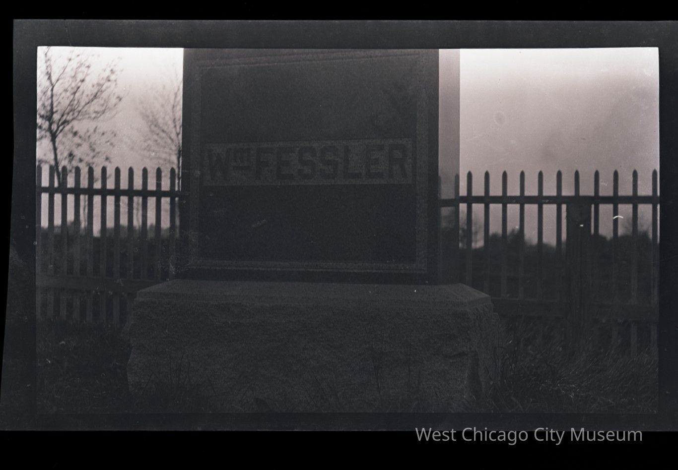 Negative and scan of William Fessler tombstone in Oakwood Cemetery, fence behind it