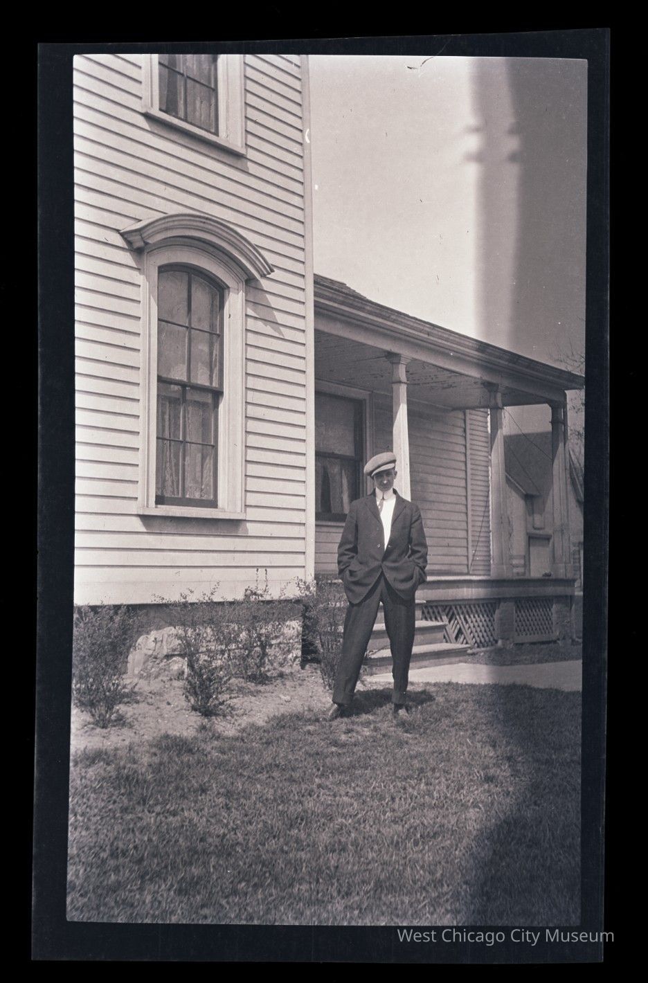 Negative and scan of young man standing in front of house, circa 1900