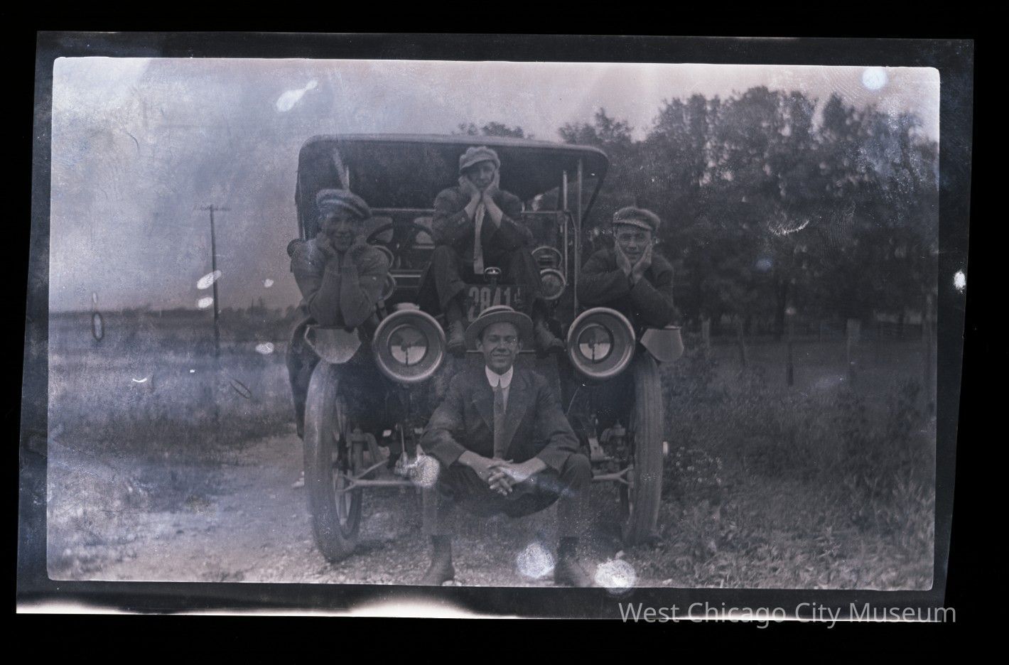 Negative and scan of four men sitting in front, on and on both sides of the car