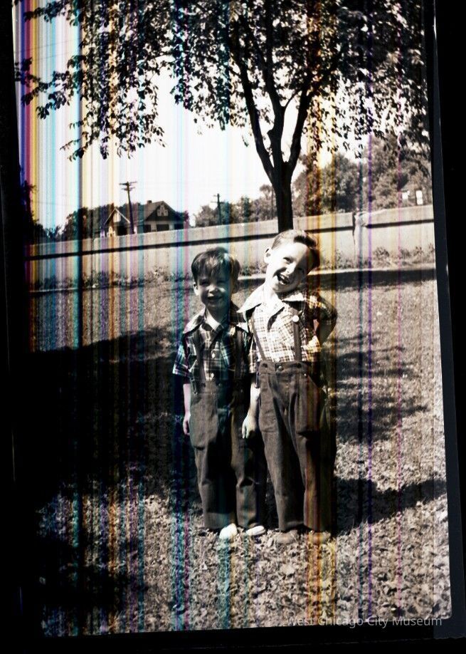 Negative and scan of two little boys in front of tree, houses and railroad tracks with cement barrier in background